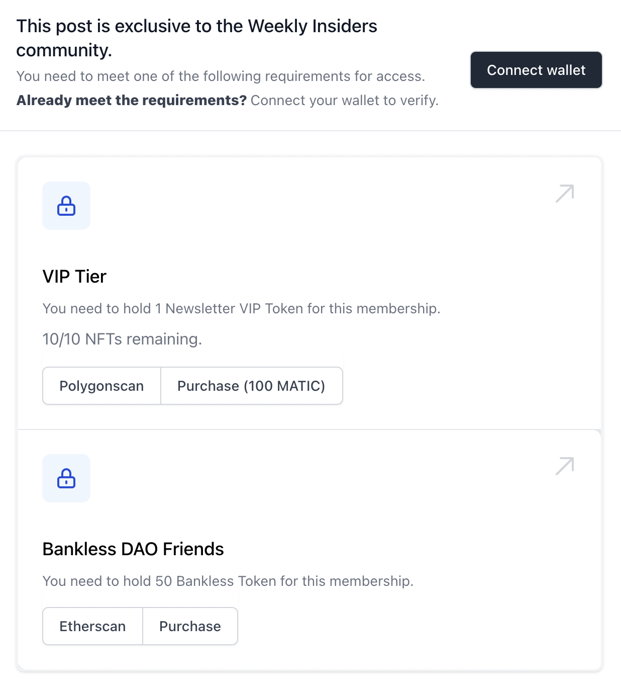 Token-gate your best posts, and sell NFTs that grant access. Give your readers ownership in your community.